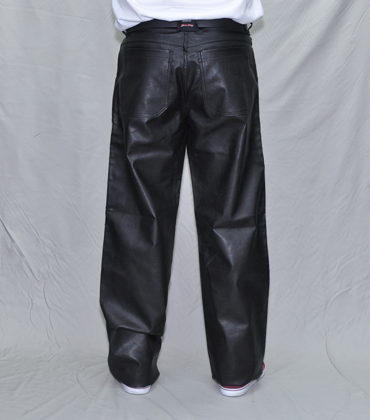 100% Faux leather, L-Fit, Musta keinonahka housu on ollut myös motoristien suosiossa, sillä keinonahka pitää hyvin myös tuulta. Housu on mitoitukseltaan L-fit ja siten myös rennön väljät. Tunnettu myös nimellä motorbike leather Jeans.