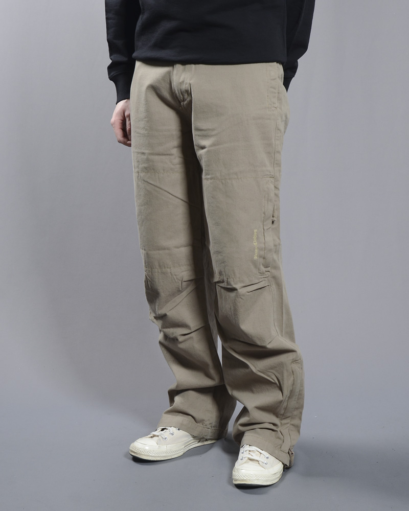 100% puuvilla - canvas Bronx Clothing todella löysä kangas housu. Mitoitus extra baggy. Housuissa molemmissa reisissä piilotetut reisitaskut vetoketjuilla ja lahkeen alisuussa myös vetoketkut molemmissa sivuissa. Lahkeen vetoketjut mahdollistavat housujen pukemisen ilman että kenkiä tarvii riisua pois. Housuissa myös oikealla vetoketjullinen takatasku. BC Zipper Parachute housut todella löysän ja rennon housun käyttäjälle. Näihin mahtuu myös paksumpikin reisilihas! Housuista saatavilla 3 eri väriä; Musta, olive ja khaki. Esikuvana housuilla on ollut armeijan laskuvarjohyppääjien housut.