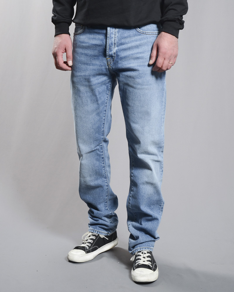 Carhartt WIP Klondike Farkut. 99% puuvillaa/ 1% elastaania. Kuvan malli 178/75 ja hänellä 32/32. Rennohko, mutta istuva farkkumalli.