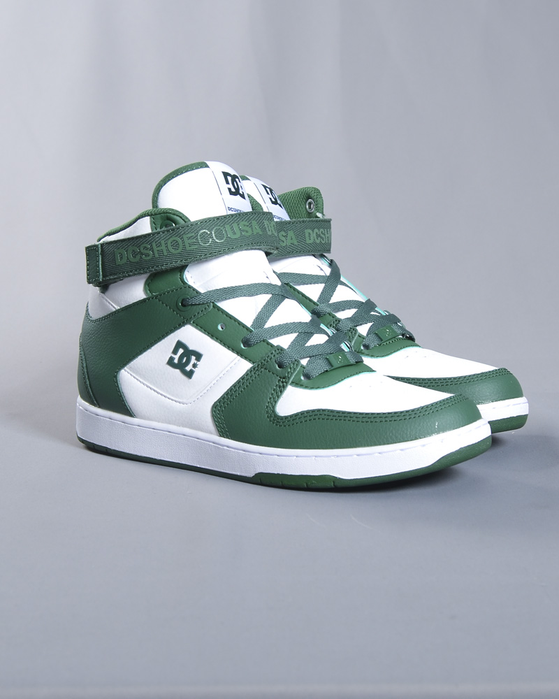 DC Shoes Pensford M kenkä on DC Shoes malliston suosittuja korkeavartista sarjaa. Materiaaleina laadukas aito nahka yhdistettynä tekstiiliin. Kenkä on yleissävyltään valkoinen ja siinä vihreällä näyttävät tehoste yksityiskohdat. DC shoes classickko high-top kenkä.