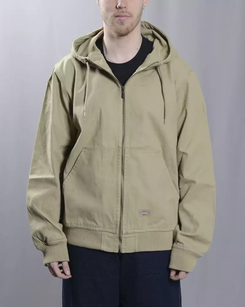 Dickies Duck Canvas hooded unlined takki. Vuoriton takki, jossa vahva Duck Canvas materiaali. Kuvan malli 178/71 ja hänellä L-koko