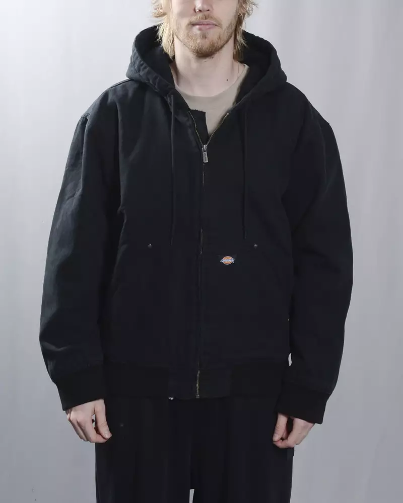 The Dickies Hillham Hooded Canvas Jacket is a timeless and durable bomber that embodies true Dickies heritage. The black canvas shell makes it versatile for everyday wear, while the details – adjustable drawstring hood, sturdy metal front zip, and ribbed cuffs and hem – add both functionality and style. The kangaroo pocket is reinforced with metal rivets, and the woven Dickies label on the pocket completes the iconic workwear-inspired look.