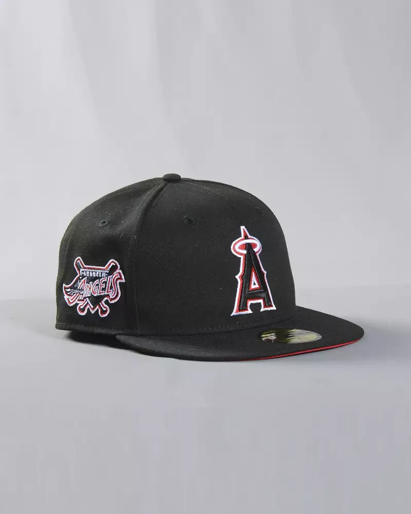The black crown and visor create a clean base, highlighted by a scarlet red undervisor. The front Angels A logo combines black, white and red for a balanced finish. The Anaheim Angels side patch on the right continues the same color theme and adds a historical touch.