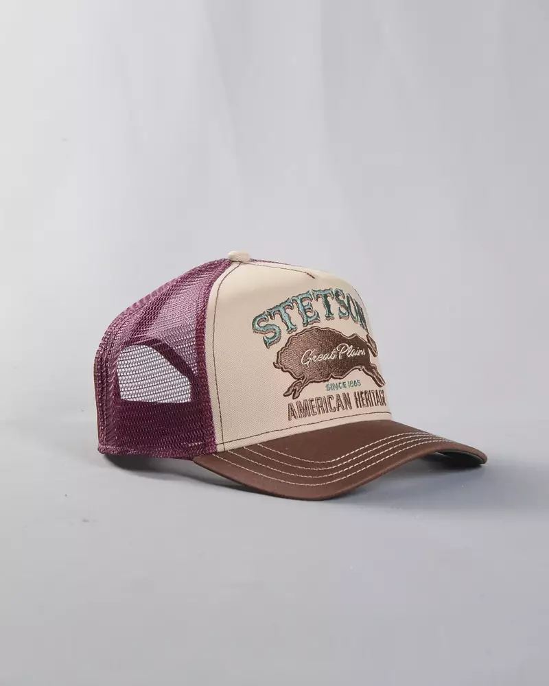 The khaki front panel features a Stetson Great Plains American Heritage embroidery that highlights the brand’s western roots. A brown visor and dark green undervisor complete the classic color combination, while the burgundy mesh back adds contrast and breathability.