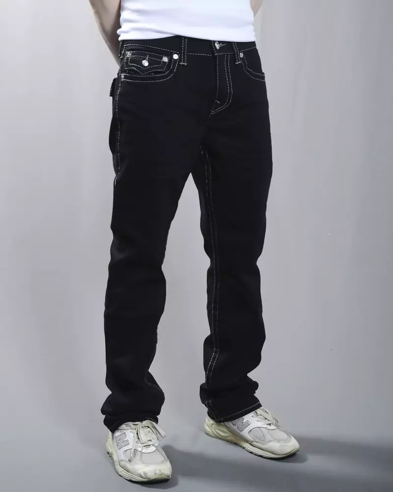 True Religion Ricky Big T Flap Jeans in black denim with grey Big T stitching. Classic straight fit with flap back pockets and signature horseshoe embroidery.