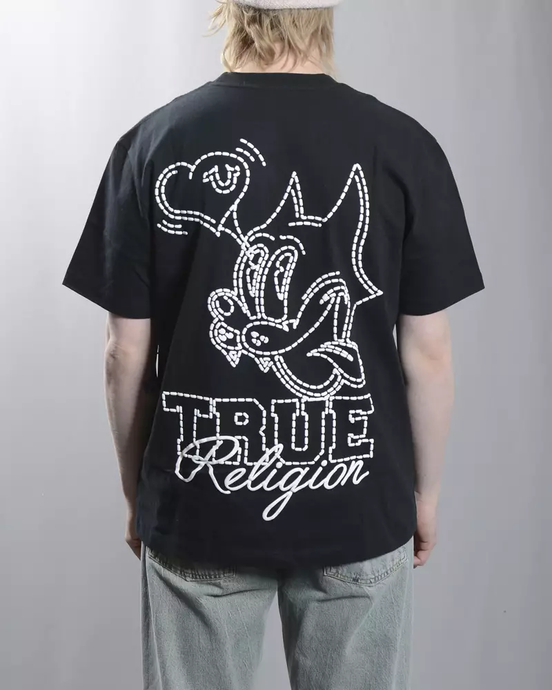The True Religion Puff Cat T Shirt features bold graphic branding with a clean silhouette. A small raised puff heart print on the chest adds subtle detail, while the back showcases a large puff-style cat graphic with True Religion branding. A classic tee designed for everyday streetwear looks.