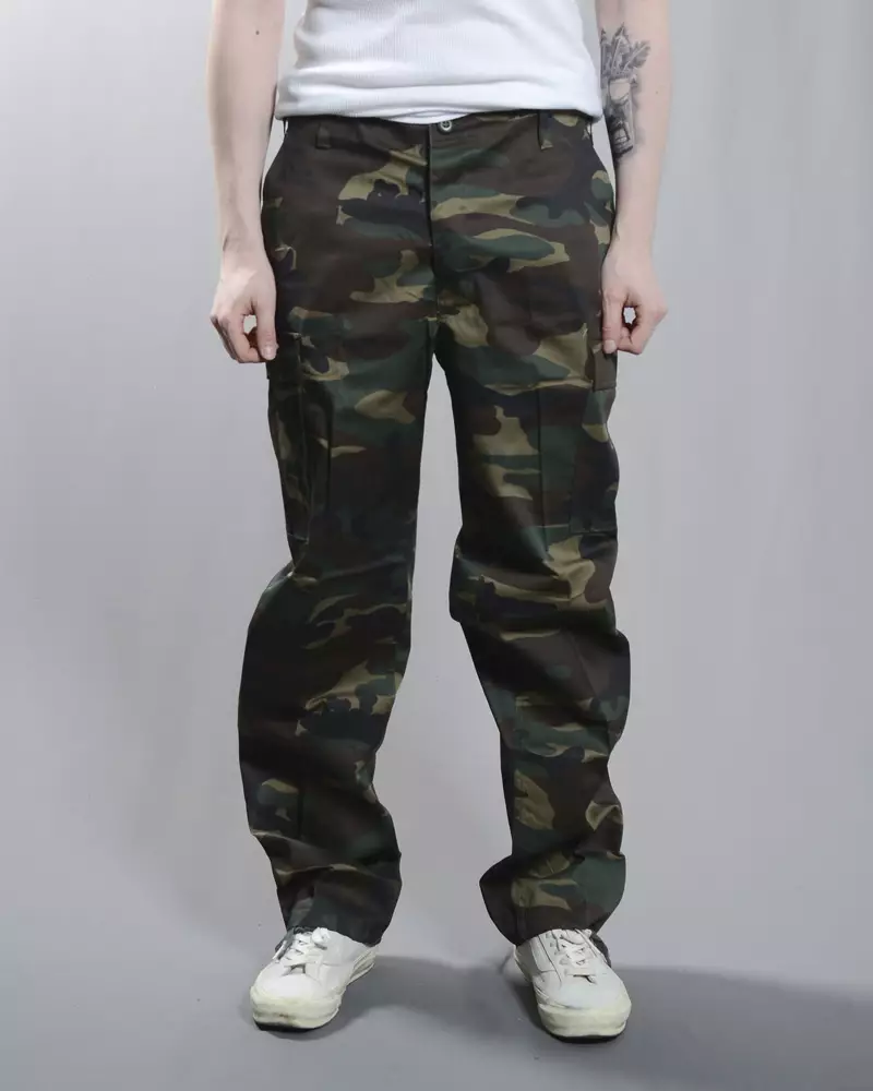 US Ranger Cargo Pants camo pants. Classic camouflage cargo pants with multiple pockets and adjustable leg openings.