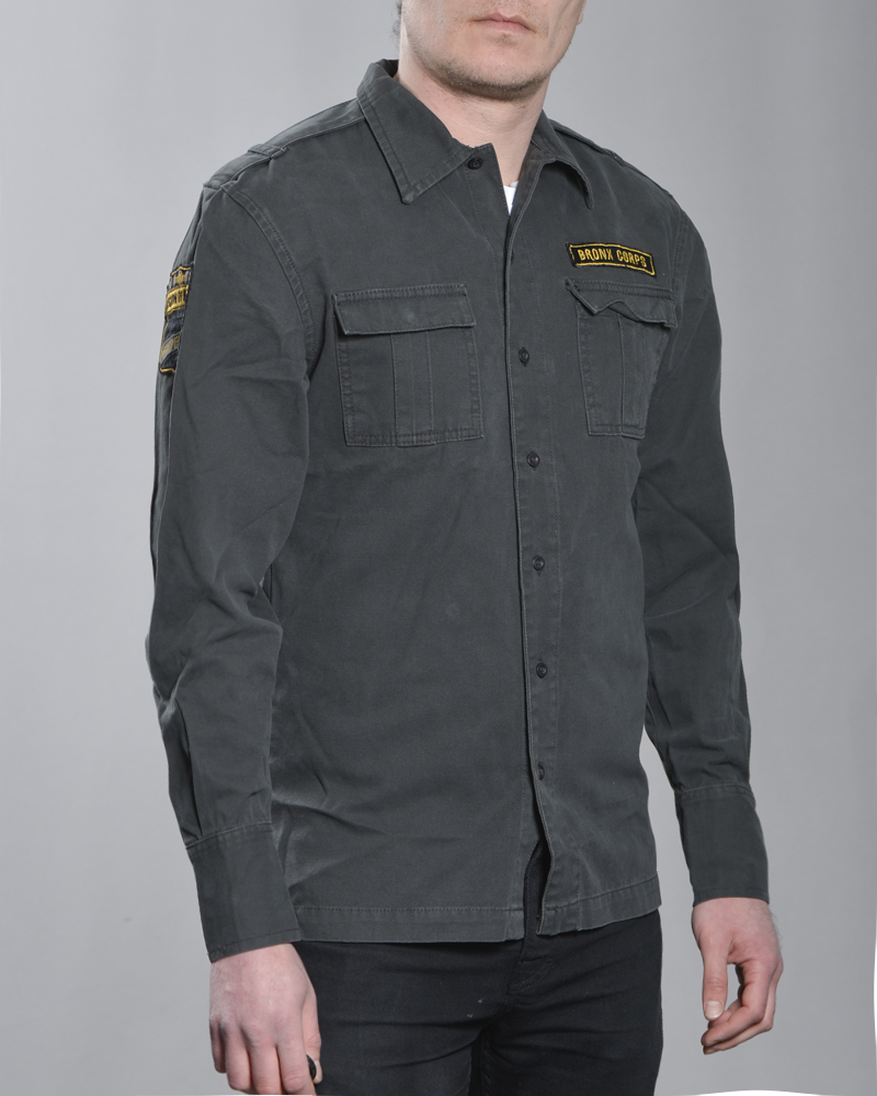 100%co/canvas / Regular fit, Stonewashed. Army henkinen tumman vihreän värinen kestävä kauluspaita on tämän hetken katumuotia. Tätä paitaa ei käyttämällä rikki saa. Paita on mitoitukseltaan reilun kokoinen. Paidan rintataskuissa on taskun sulkeminen piiloneppareilla. Rinnassa on Bronx Corps kangasmerkki ja oikeassa olkapäässä Legion of merit kangasmerkki. US army henkinen field kauluspaita laatutietoisille. Laaja valikoima kauluspaitoja Bronx Netstoresta.