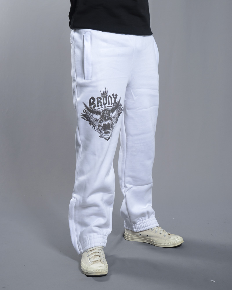 Bronx Clothing valkoinen collegehousu, jossa on vetoketjulliset taskut ja kiristys myös lahkeiden alasuussa. Mitoitus löysä.