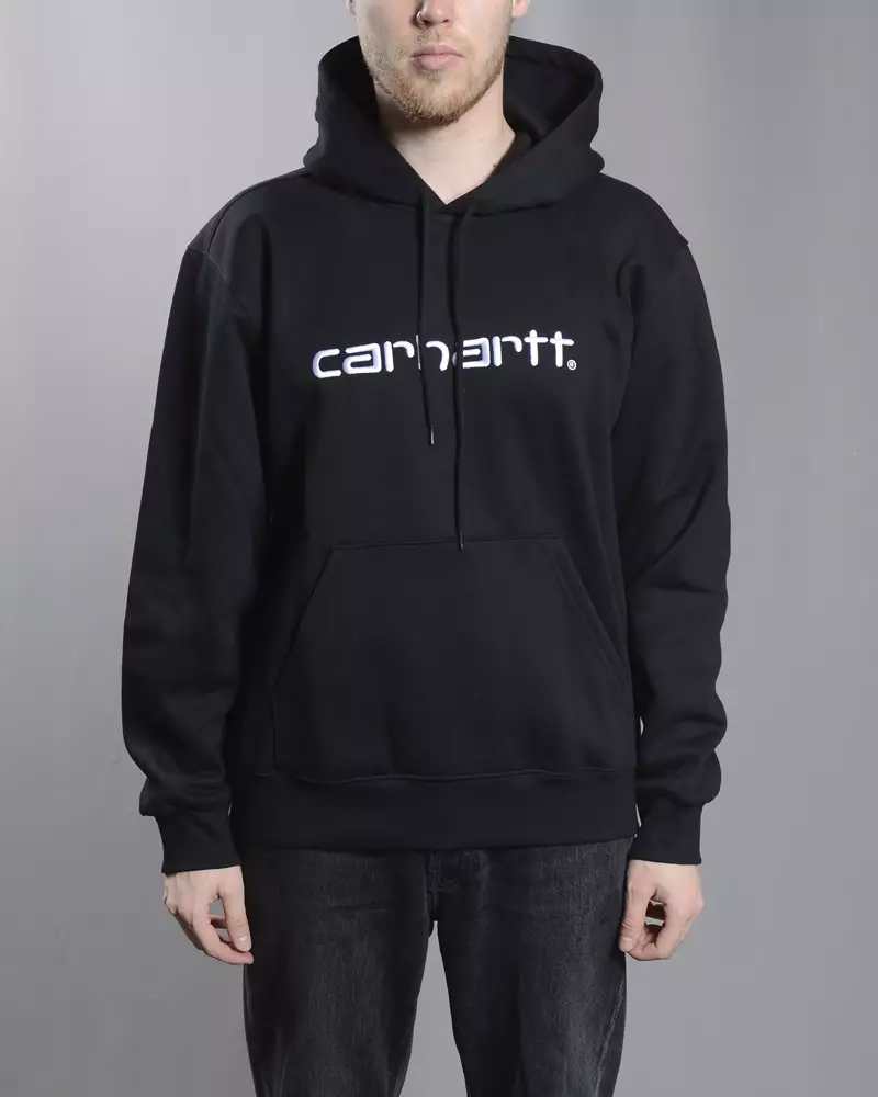 CARHARTT WIP Hooded Musta Huppari. 58% puuvillaa / 42% polyester.Kuvan malli 178/71 ja hänellä M-koko