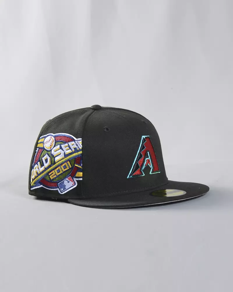 New Era 59FIFTY Arizona Diamondbacks fitted lippis Hidden Hit mallistosta. Musta väri, iso World Series 2001 sidepatch, harmaa alalippa brodeerauksella ja MLB Batterman takana.