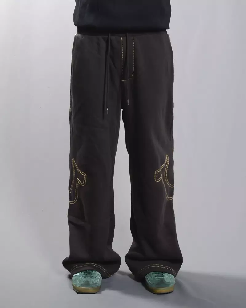 True Religion Baggy Big T Sweatpant collegehousu Ganache-värissä. Rento baggy fit, Big T tikkaus, hevosenkenkälogo ja merkkilappu takataskussa.